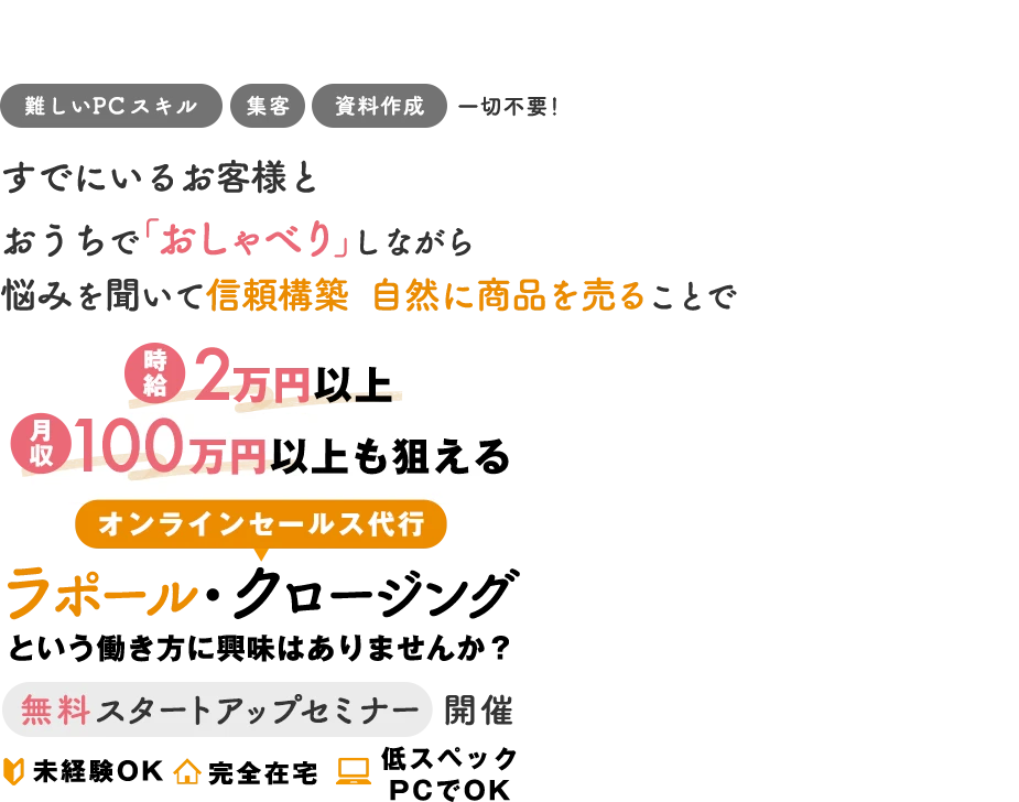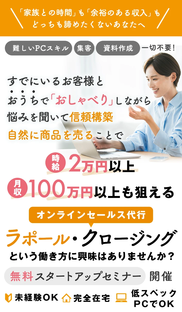 外に働きに出るのがバカらしくなるほど、 短時間で大きな収入を得られるのが 「オンラインセールス代行」の最大の魅力です。